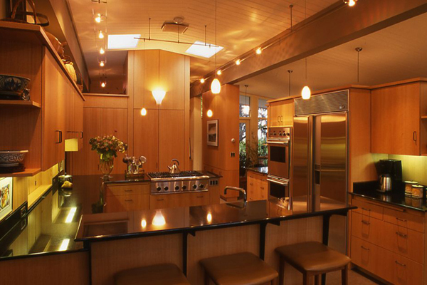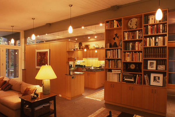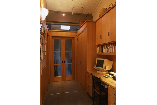 In the course of the work, the original concrete beams and columns were uncovered and developed as signatures of the larger framework of the central unit. They were left exposed and painted the exterior color to articulate their structural identity and to reinforce its inside-outside relationship. The interior components were given warmth and character through the use of rift-sawn red oak for cabinets and paneling. The design establishes an interplay between the exterior envelope and the interior “furniture”. This technique simplified the finishes, and changed the spatial system from separate rooms to places that are more open and connected.