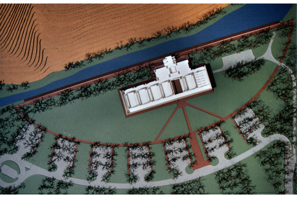 The site of the Tribal Museum is developed as an oasis in the high desert country of the Warm Springs Reservation. The museum is positioned next to Shitike Creek at one edge of the site on a base of fill required to put it above the 100-year flood plain. A series of tree-lined parking areas next to Highway 26 form an arc around an open meadow to create a landscape threshold between the cars and the Museum. Across this meadow from the parking areas, the Museum entry sequence passes through the base of the building and arrives at the creek edge.